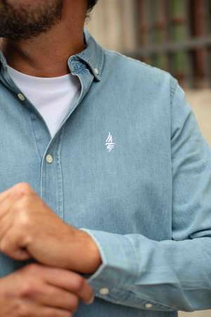 Denim tissé 100% coton Organic Ring Spun peigné, coupe droite avec broderie poitrine.