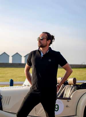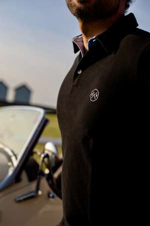 Polo noir en coton Bio. Coupe classique, patte surpiquée 3 boutons, col chemise doublé en bleu ciel avec bande anti-transpiration, fentes de cotés et bord/côtes tricotés.