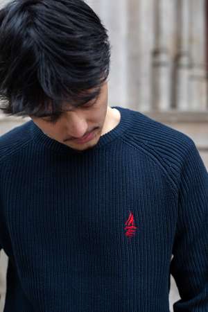 Pull homme lourd et épais, écoresponsable à grosses mailles marine. Manches raglan.