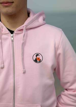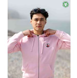 Sweat à capuche zippé rose unisexe, coupe normale.