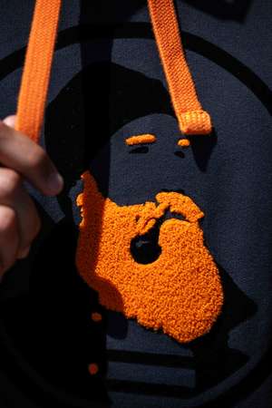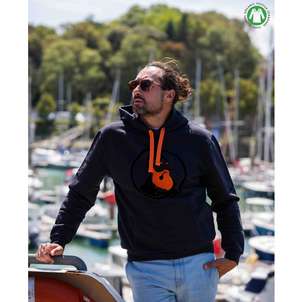 Sweat à capuche dark navy avec broderie bouclettes. Coupe classique, coton Bio, intérieur molleton brossé.