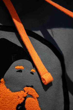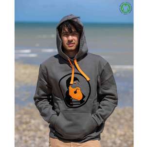 Sweat à capuche kaki avec broderie bouclettes. Coupe classique, coton Bio, intérieur molleton brossé.