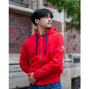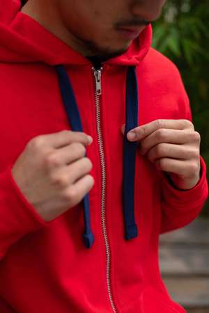 Sweat à capuche rouge zippé unisexe iconique, coupe normale.