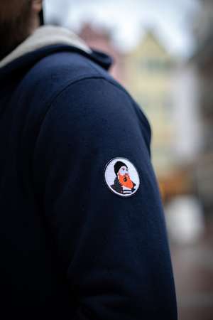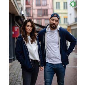 Sweat à capuche zippé navy unisexe doublé en Sherpa recyclé, coupe classique.